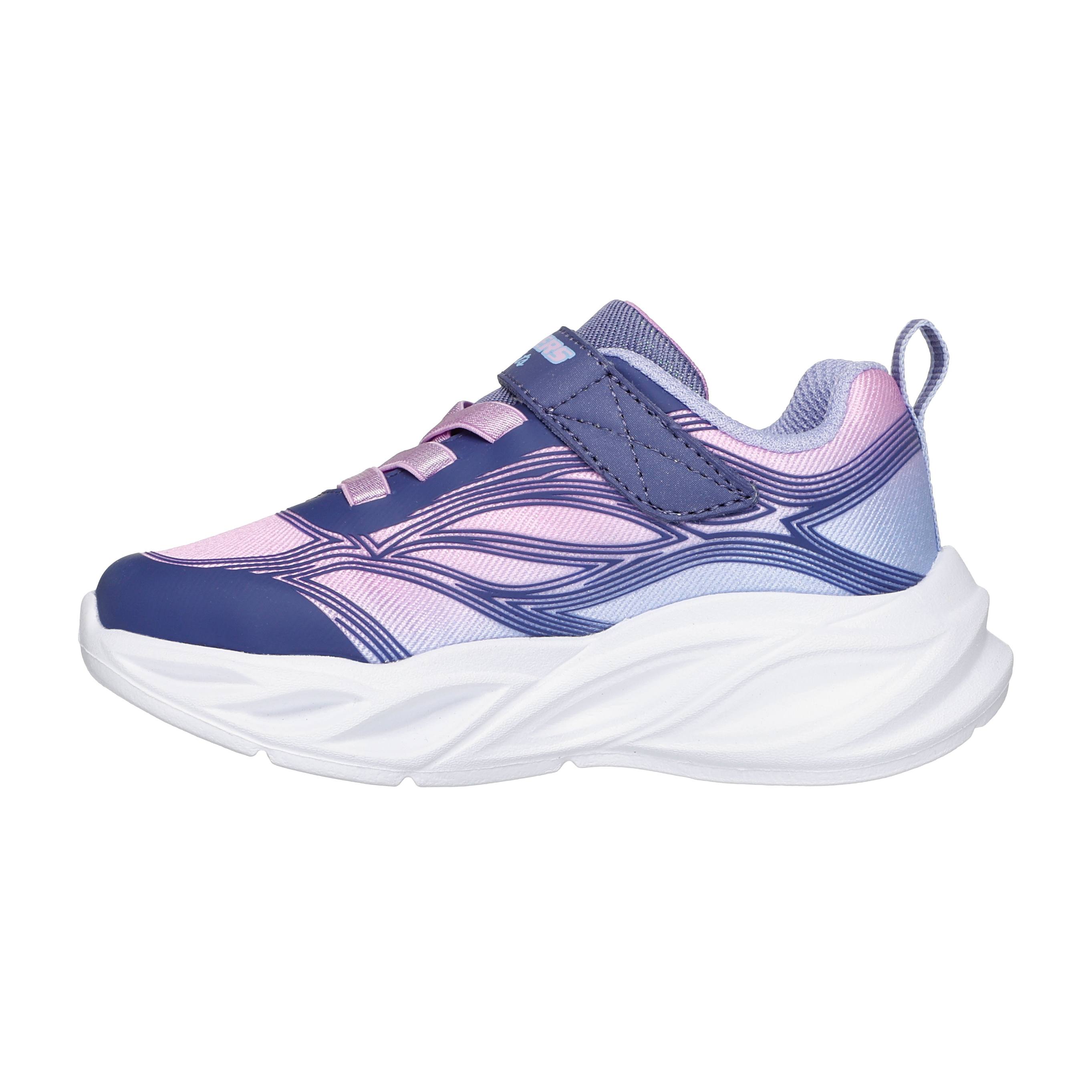 Light up the playground wearing Skechers S-Lights®: Cosmic Glow. This light-up active design features an ombre sparkle mesh and synthetic upper with stretch laces, an adjustable instep strap, and a well-cushioned midsole with step-activated lights.