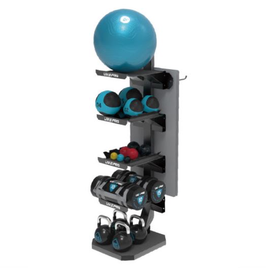 This universal rack can store kettlebells, fitness bags, vinyl hand weights, medicine balls, gym balls and fitness mats on the back. A true all-rounder. Ideal for small personal training studios or at home.